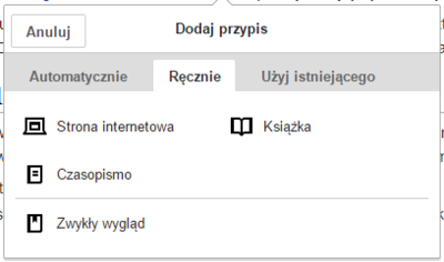 | „Przypis”: przycisku „Przypis” używamy do dodania przypisów. Oprogramowanie spróbuje samodzielnie wypełnić szablon podawania źródła. | |