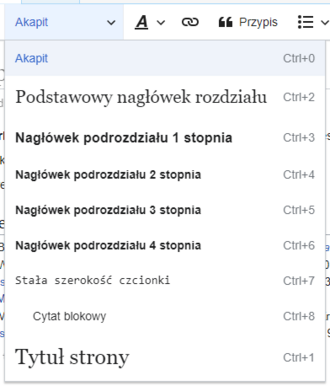 | Nagłówki (menu rozwijane): pozwala zmienić formatowanie tekstu. Aby zmienić styl akapitu, należy umieścić kursor w tekście (nie ma potrzeby zaznaczania czegokolwiek). Tytuły sekcji są formatowane jako „Nagłówek rozdziału”, a podsekcji jako „Nagłówek rozdziału”, „Nagłówek podrozdziału 1 stopnia” itd. Zwykłe formatowanie tekstu to „Akapit”. | |