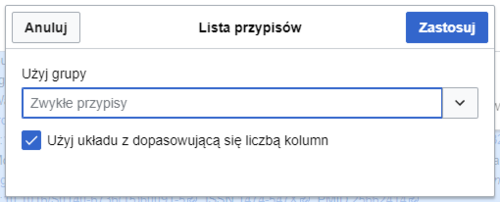| Jeżeli strona nie zawiera jeszcze listy przypisów (np. tworzysz właśnie pierwszy przypis), trzeba ją dodać, aby treść przypisów wyświetlała się na stronie.