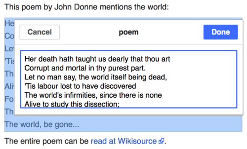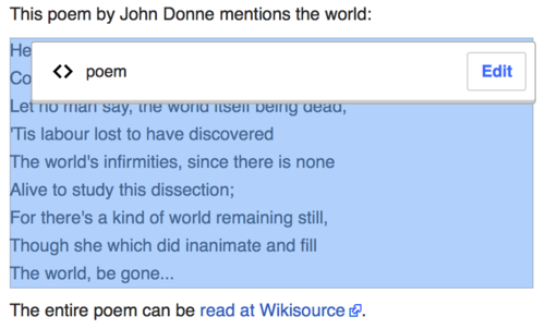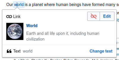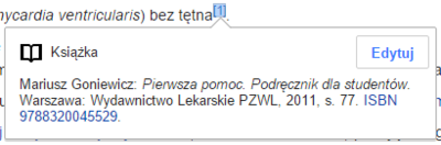 | Aby zmienić istniejący przypis, kliknij na niego (zazwyczaj to liczba w nawiasie). Zobaczysz popup ze szczegółami przypisu. Kliknięcie tutaj na „Edytuj” otworzy okno, w którym możesz zmienić przypis. | |