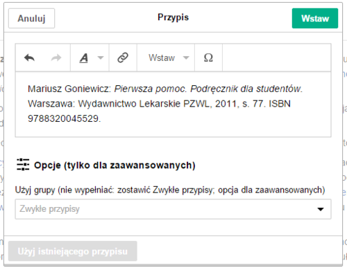 Ostatnim krokiem w oknie edycji grup przypisów jest kliknięcie na „Wstaw”. |