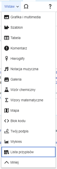 Umieść kursor w miejscu, w którym ma wyświetlać się lista przypisów (zwykle na dole strony) i otwórz menu „Wstaw” i kliknij na ikonę „Lista przypisów” (obrazek trzech książek). Zamiast ręcznego wstawiania przypisów możesz też użyć jednego z szablonów: |