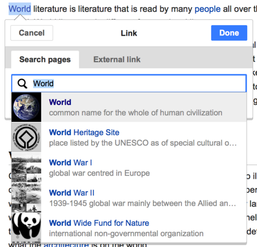 VisualEditor wyszuka proponowane linki wewnętrzne pasujące do tego, co wpiszesz. | |