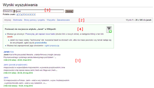 Na pasku [2] można wybrać wyszukiwanie multimediów (plików), a także na wszystkich stronach (pomocy, szablonów, portali, wikipedystów itp.), można też wybrać bardziej konkretnie w opcji „zaawansowane” (różne rodzaje zawartości znajdują się w różnych przestrzeniach nazw). Bliżej górnej części strony [3] widać słowo (lub słowa), które były wyszukiwane. |