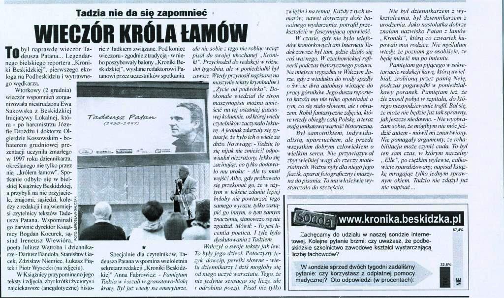 [edytuj | edytuj kod]- ↑ a b c „Niezapomniani: Tadeusz Patan – król łamów”, zob. Wieczór króla łamów - Kronika Beskidzka, Beskidzka Inicjatywa Lokalna, beskidzkainicjatywalokalna.pl, [dostęp 2025-05-09].