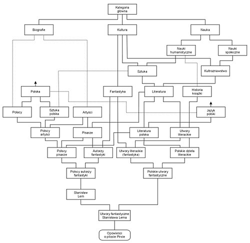 W poniższym diagramie, węzły będące linkami do artykułu oznaczają dany artykuł, a pozostałe węzły są kategoriami.