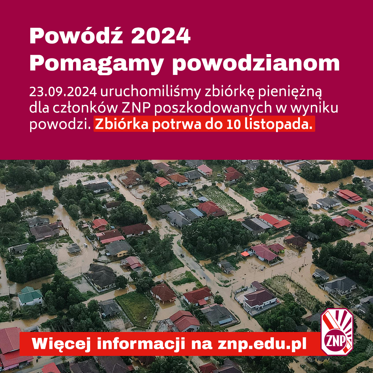 23 września 2024 roku Związek Nauczycielstwa Polskiego uruchomił „zbiórkę środków pieniężnych w celu wsparcia finansowego członków ZNP, którzy zostali poszkodowani w wyniku powodzi we wrześniu 2024 r.”